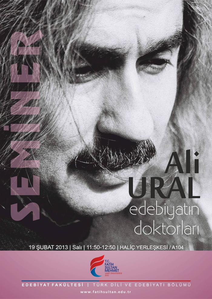 Üniversitemiz Edebiyat Fakültesi Türk Dili ve Edebiyatı Bölümü tarafından düzenlenen "Edebiyatın Doktorları Semineri", Ali Ural'ın katılımıyla 19 Şubat 2013 Salı günü 11.50-12.50 saatleri arasında Haliç Yerleşkesi A-104 No'lu Salonda gerçekleştirilecektir.