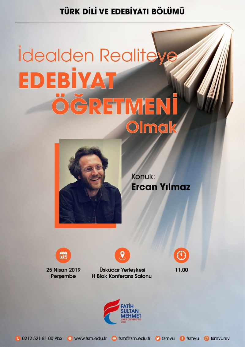 Edebiyat Fakültesi Türk Dili ve Edebiyatı Bölümü öğrencilerine yönelik düzenlenen "İdealden Realiteye Edebiyat Öğretmeni Olmak" etkinliği 25 Nisan 2019 Perşembe günü saat:11:00'da Üsküdar Yerleşkesi Konferans Salonunda gerçekleştirilecektir.