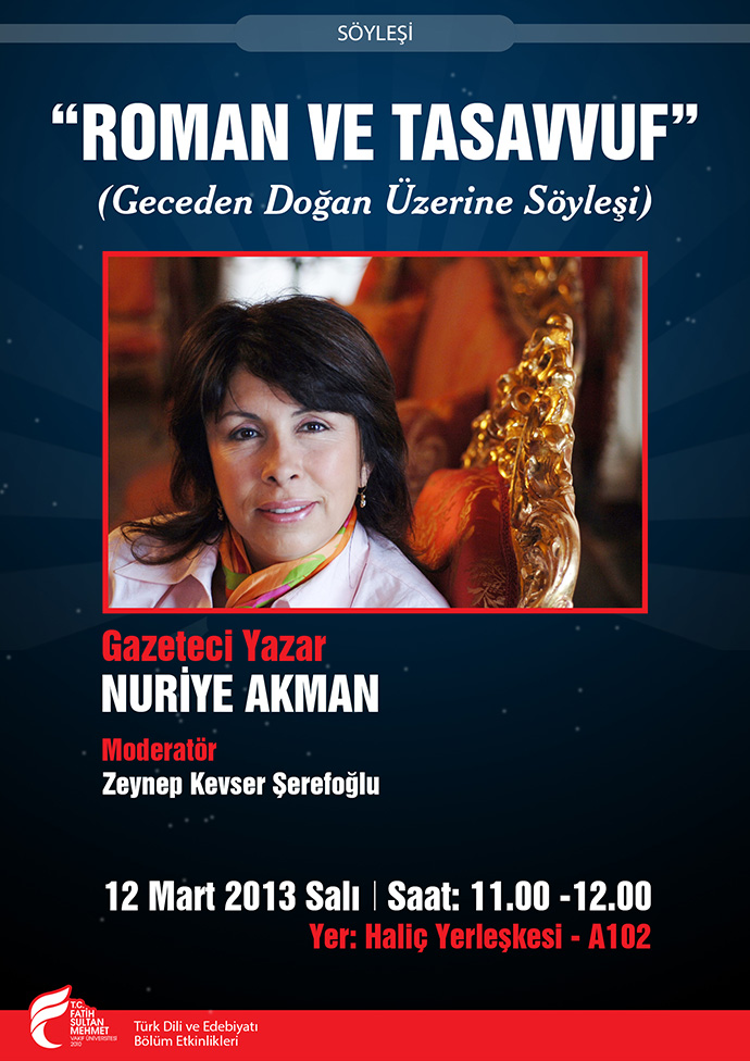 Üniversitemiz Edebiyat Fakültesi Türk Dili ve Edebiyatı Bölümü tarafından düzenlenen Gazeteci-Yazar Nuriye Akman'ın konuşmacı olarak katılacağı Roman ve Tasavvuf: Geceden Doğan Üzerine Söyleşi programı, Yrd. Doç. Dr. Zeynep Kevser Şerefoğlu moderatörlüğünde 12 Mart 2013 Salı günü 11.00-12.00 saatleri arasında Haliç Yerleşkesi A-102 No'lu Salonda gerçekleştirilecektir.