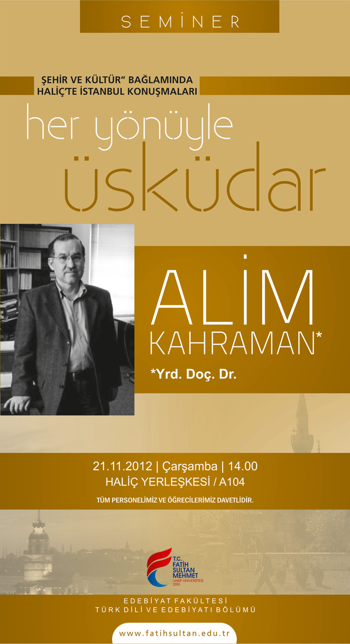 Üniversitemiz Edebiyat Fakültesi Türk Dili ve Edebiyatı Bölümü tarafından düzenlenen "Şehir ve Kültür Bağlamında Haliç'te İstanbul Konuşmaları:Her Yönüyle Üsküdar Semineri", Alim Kahraman'ın katılımıyla 21 Kasım 2012 Çarşamba günü saat: 14.00'de Haliç Yerleşkesi A-104 No'lu Salonda gerçekleştirilecektir.