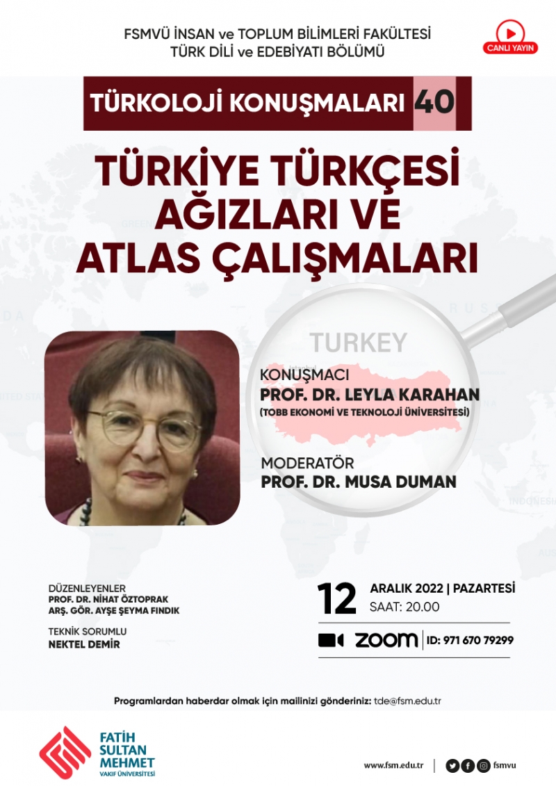 Türkoloji Konuşmaları 40. oturumunda "Türkiye Türkçesi Ağızları ve Atlas Çalışmaları" başlığıyla Prof. Dr. Leyla Karahan'ı ağırlayacak.