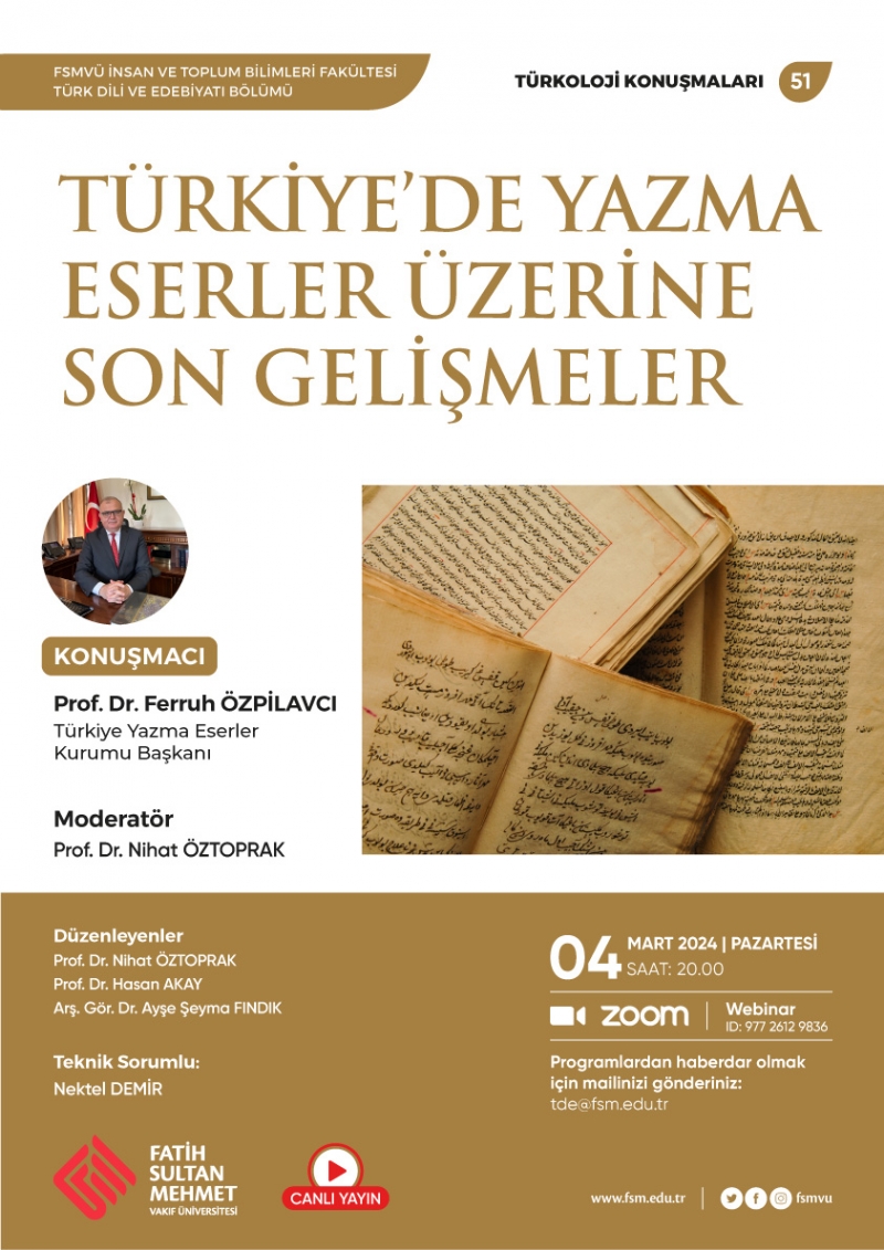 Türkoloji Konuşmaları, 51. oturumunda Türkiye'de Yazma Eserler Üzerine Son Gelişmeler başlıklı konuşmasıyla Türkiye Yazma Eserler Kurumu Başkanı Prof. Dr. Ferruh Özpilavcı'yı ağırlayacak.