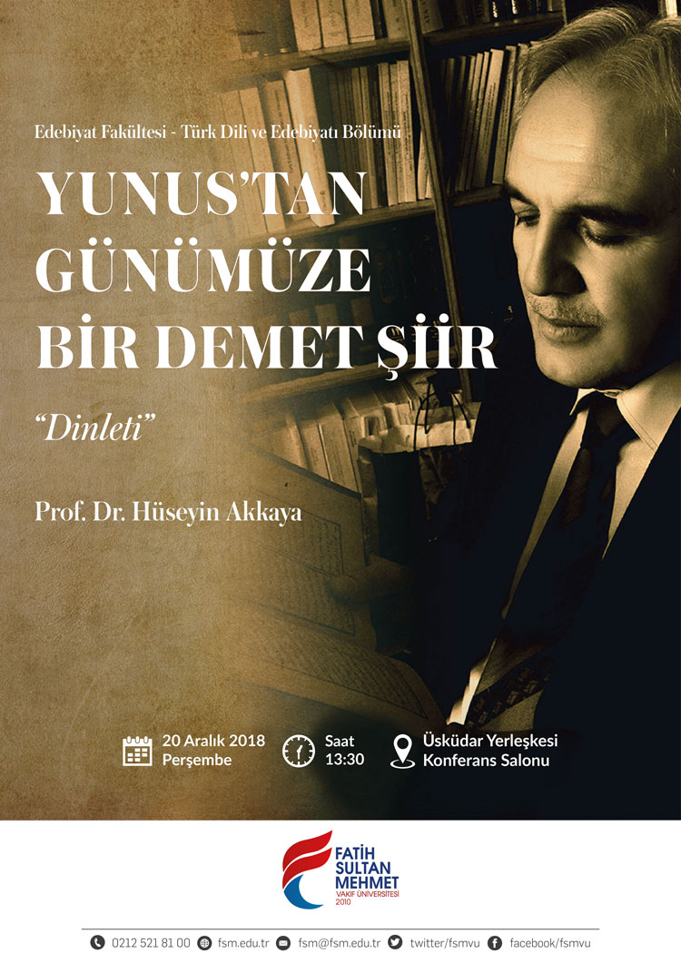 Türk Dili ve Edebiyatı Bölümü tarafından düzenlenen "Yunus'tan Günümüze Bir Demet Şiir" dinletisi, Prof. Dr. Hüseyin AKKAYA'nin katılımıyla 20 Aralık'ta Üsküdar Yerleşkesi Konferans Salonunda gerçekleştirilecektir.