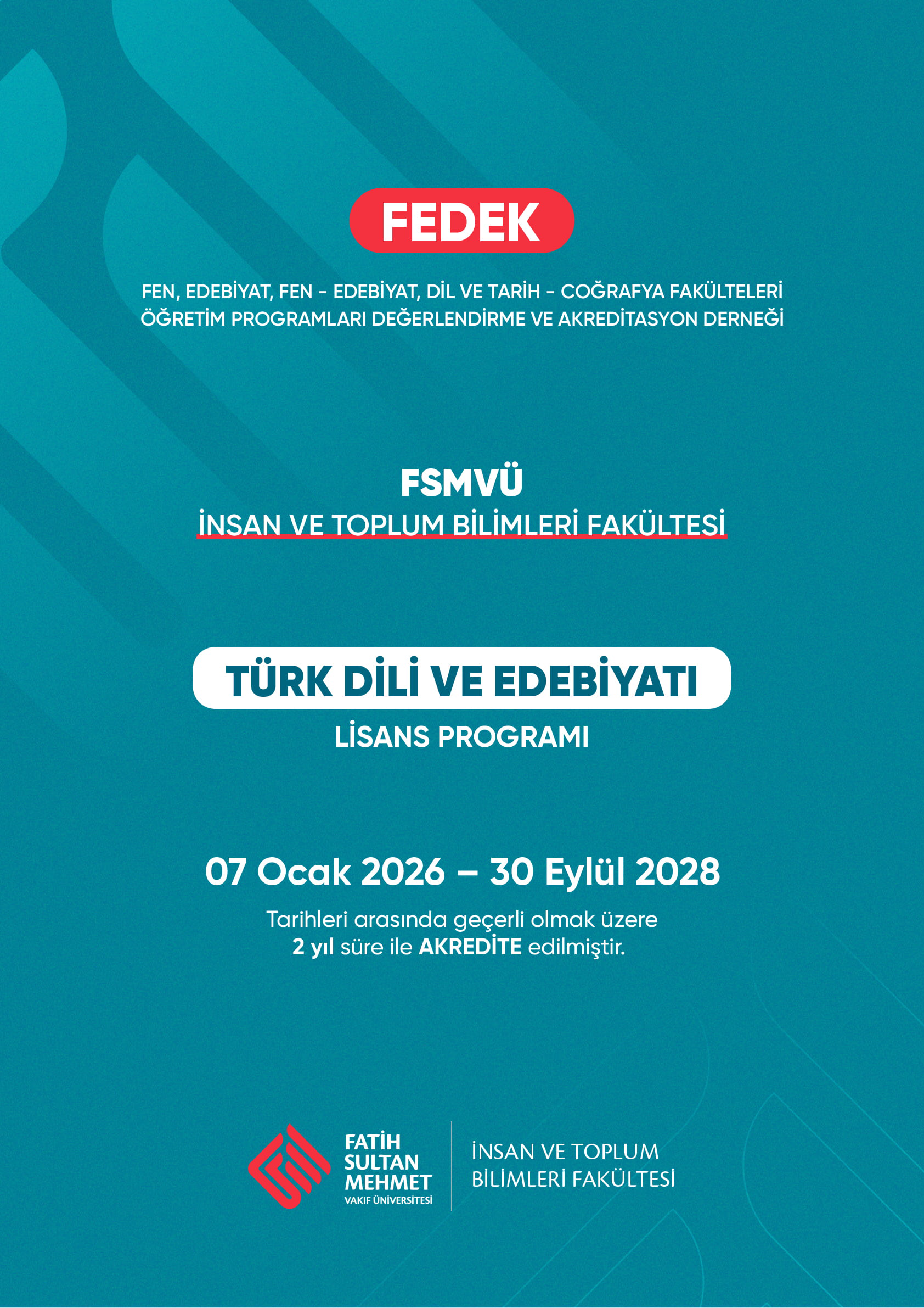 FEDEK Akreditasyon Derneğinin 09.01.2026 tarih ve 2026/033 sayılı yazısı ile İnsan ve Toplum Bilimleri Fakültesi’nin 2025 Değerlendirme Döneminde FEDEK tarafından İlk Kez Genel Değerlendirmeleri yapılan; Türk Dili ve Edebiyatı Programına 2 (iki) yıllık AKREDİTASYON verilmiştir. Bu süreçte emeği geçen Bölüm Başkanımıza ve Akreditasyon Sorumlularımıza teşekkür ederiz.