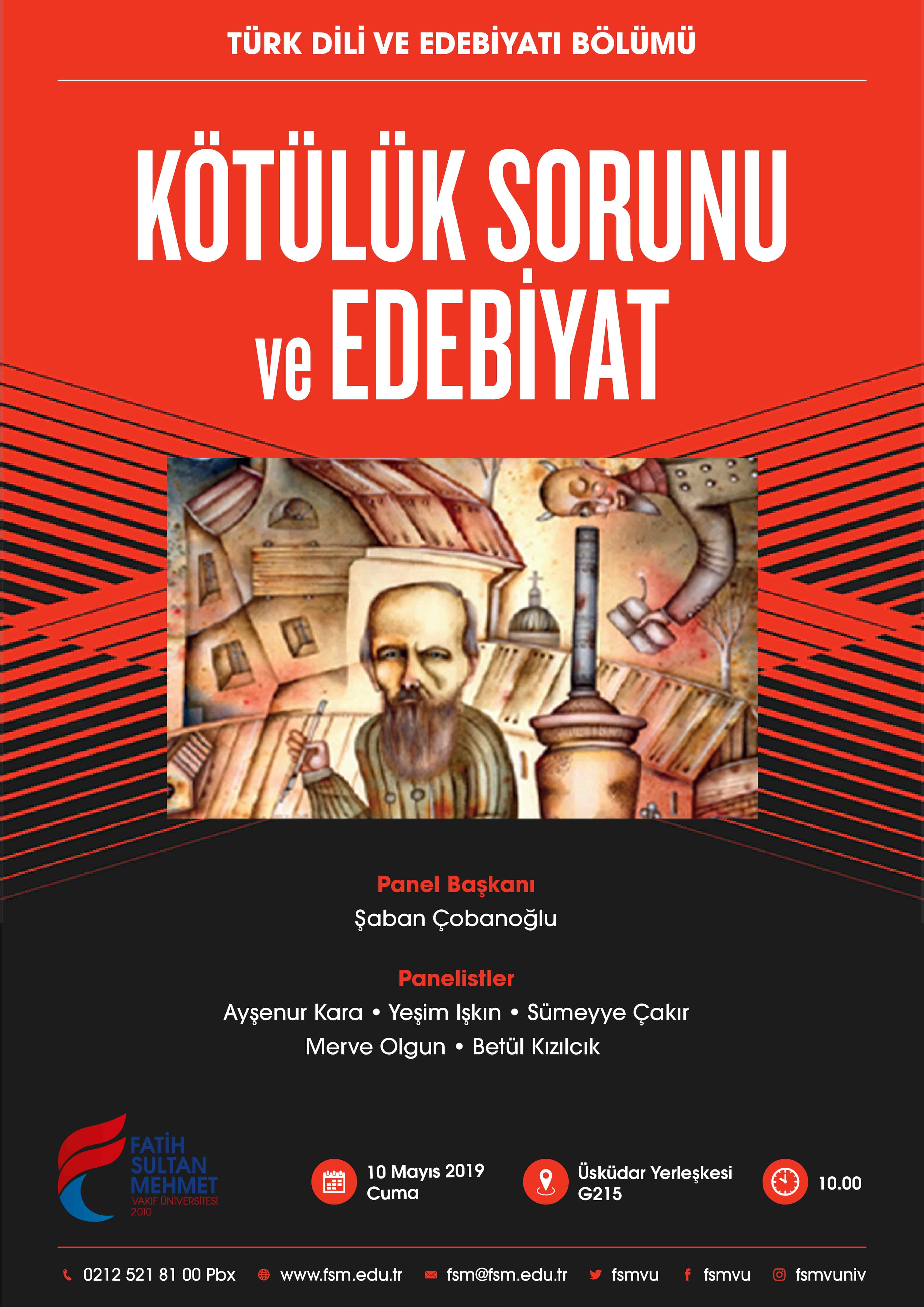 Edebiyat Fakültesi öğrencileri, Dr. Öğr. Üyesi Şaban Çobanoğlu’nun yönetiminde düzenlenecek panelde edebiyattaki kötülük ve kötüler üzerine konuşacak. “Kötülük Sorunu ve Edebiyat” paneli, 10 Mayıs 2019’da Üsküdar Yerleşkesi G215’te dinlenebilir.
