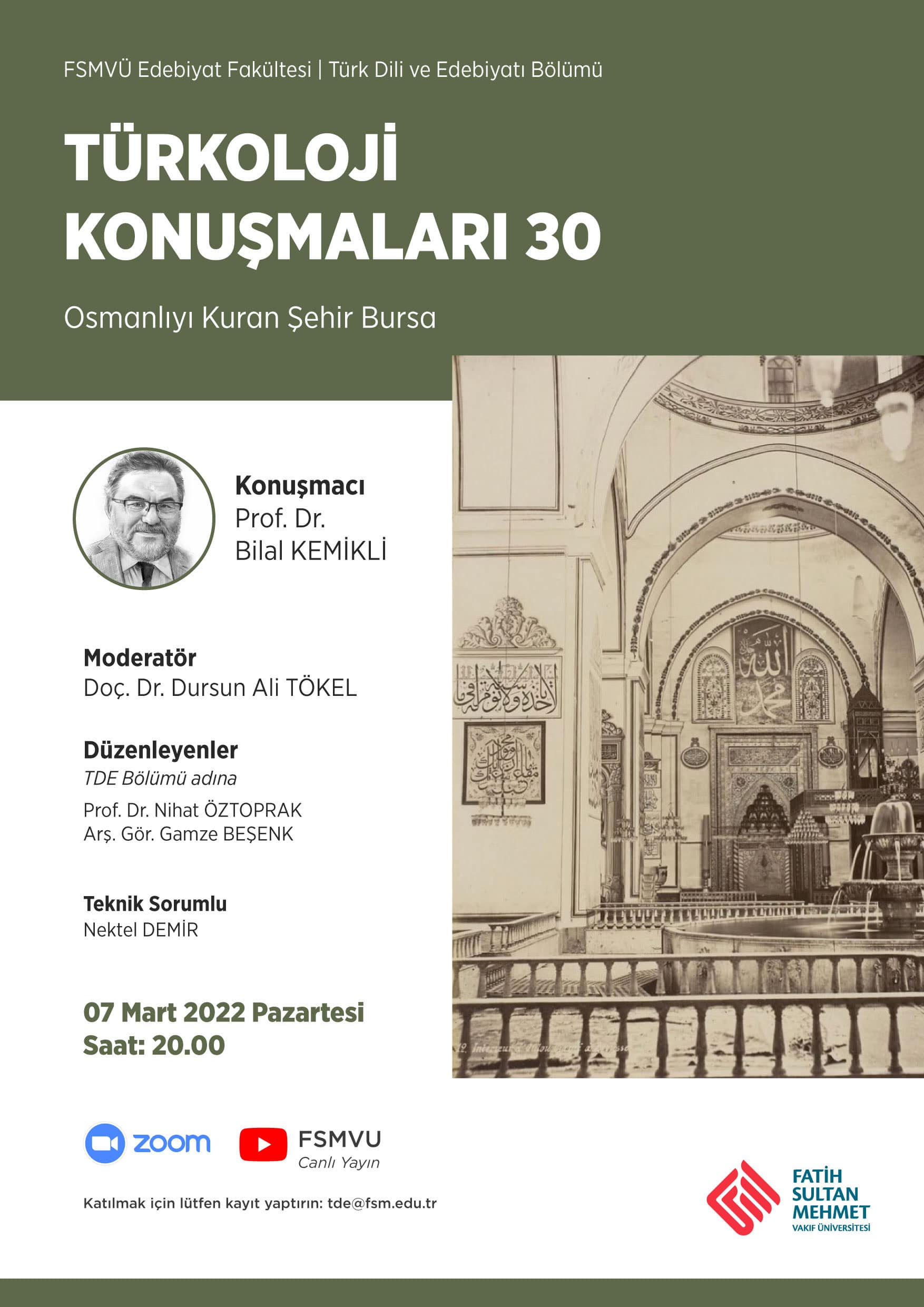 Türk Dili ve Edebiyatı Bölümü tarafından düzenlenen konuşma dizisi Türkoloji Konuşmaları 30. programı ile kaldığı yerden devam ediyor. "Osmanlıyı Kuran Şehir Bursa” konu başlığıyla, Prof. Dr. Bilal Kekmikli'nin katılımıyla 7 Mart 2022, Zoom ve FSMVÜ YouTube hesabında düzenlenecektir.
