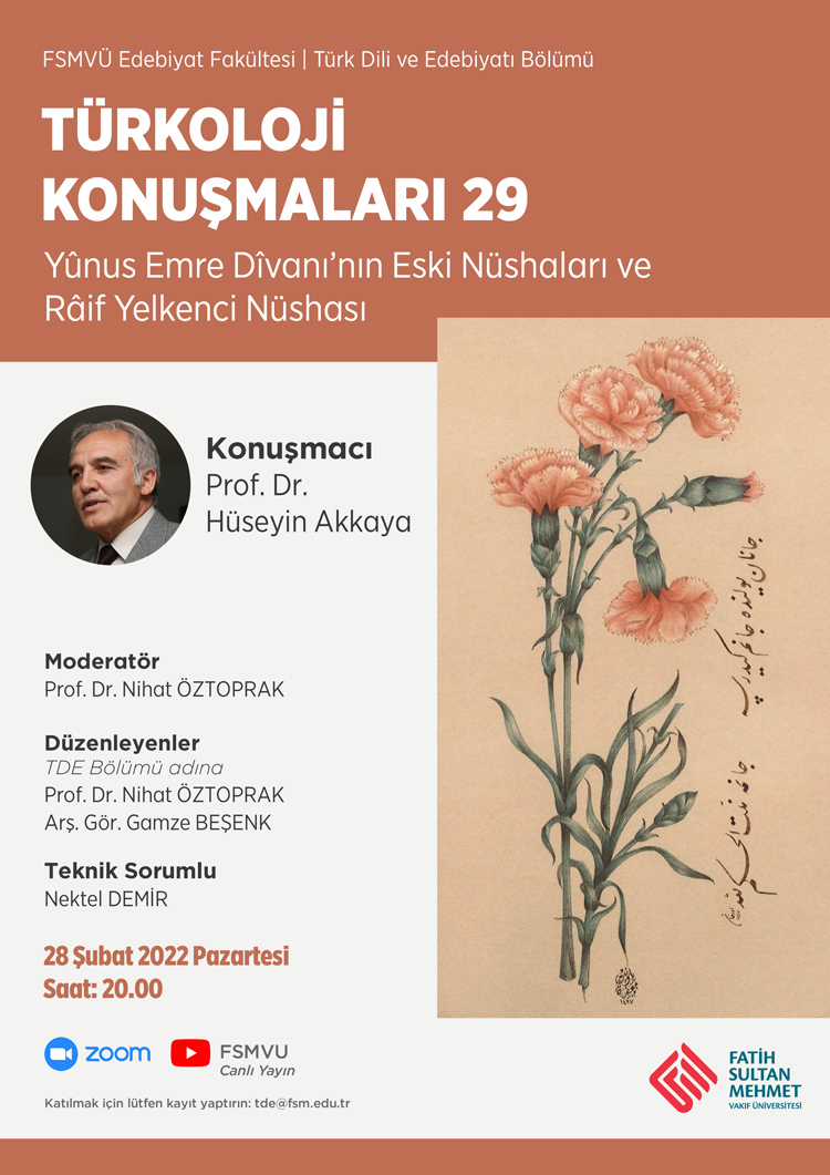 Türk Dili ve Edebiyatı Bölümü tarafından düzenlenen uzun soluklu konuşma dizisi Türkoloji Konuşmaları 29. programı ile kaldığı yerden devam ediyor. "Yûnus Emre Dîvanı'nın Eski Nüshaları ve Râif Yelkenci Nüshası” konu başlığıyla, Prof. Dr. Hüseyin Akkaya'nın katılımıyla 28 Şubat 2022, Zoom ve FSMVÜ YouTube hesabında düzenlenecektir.