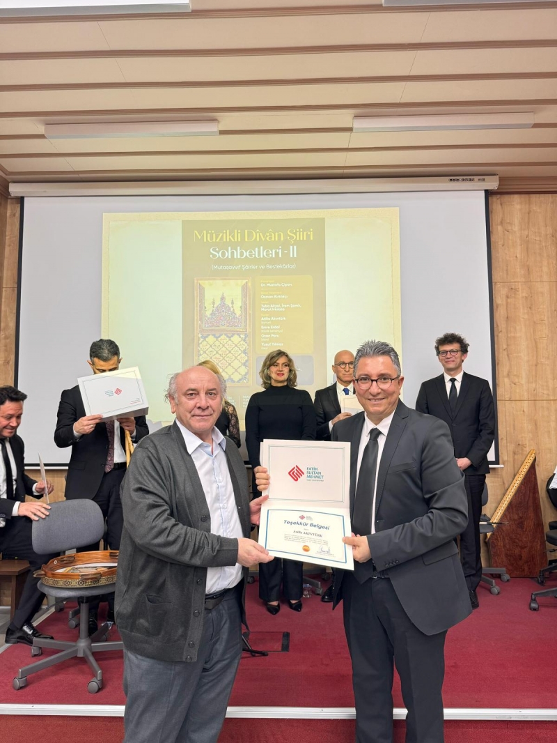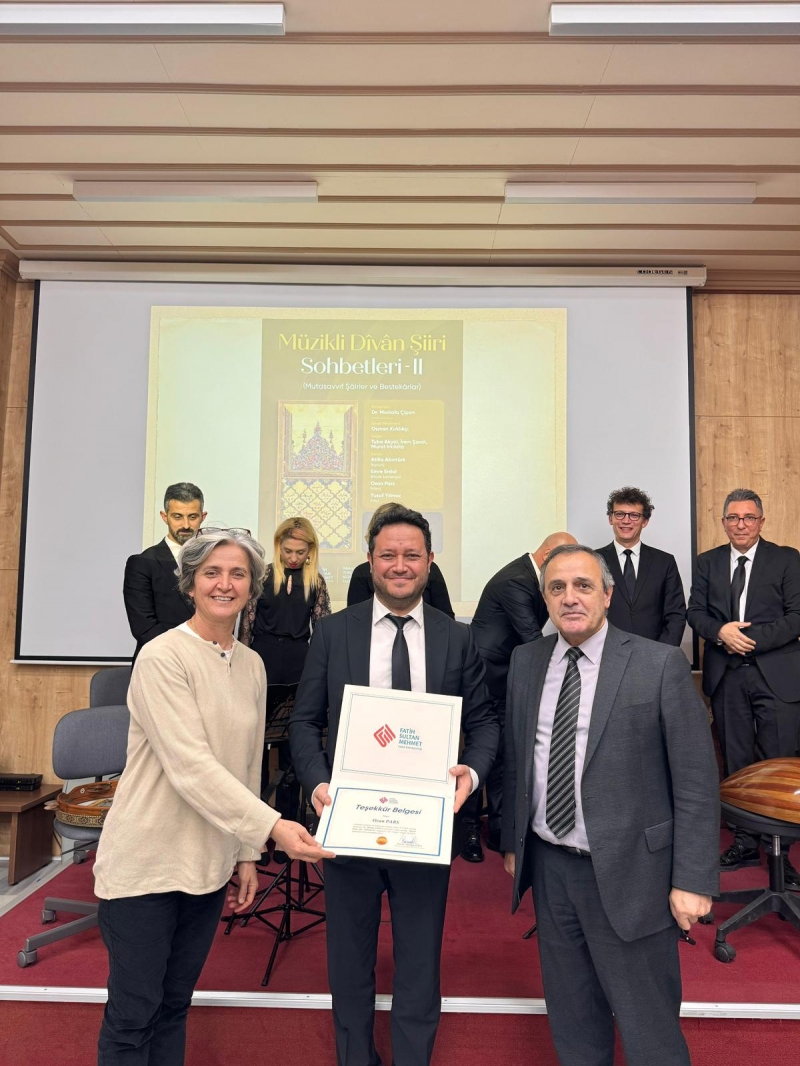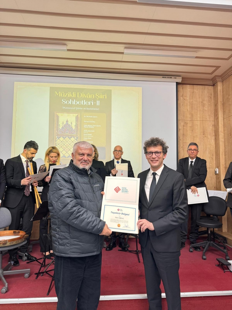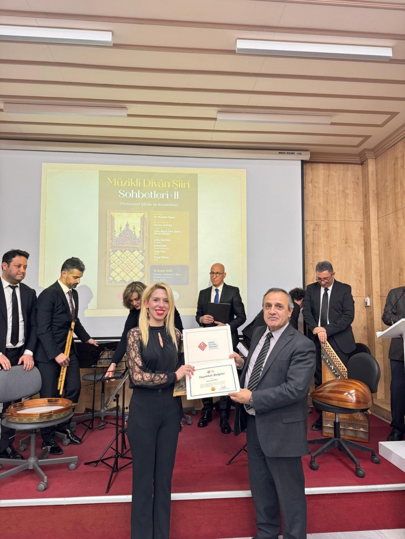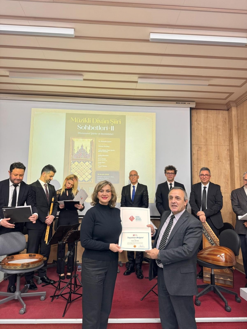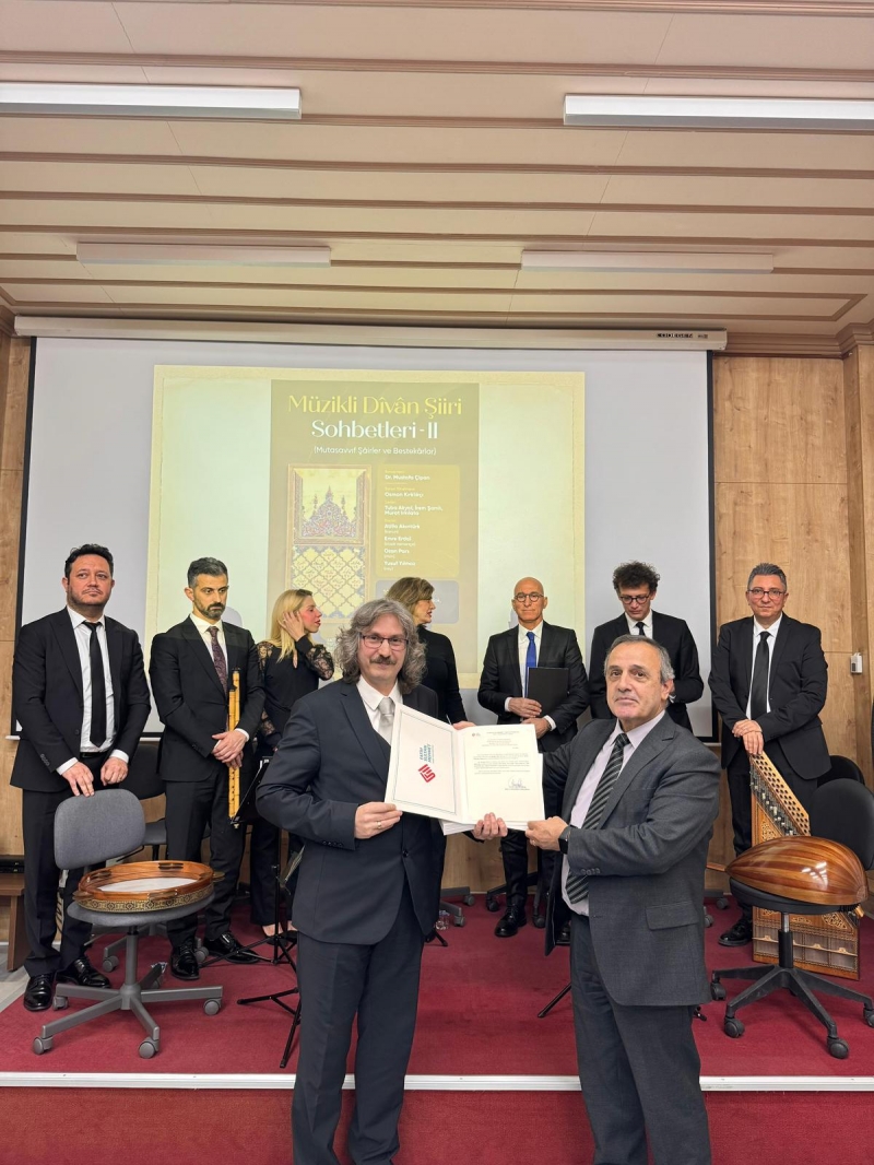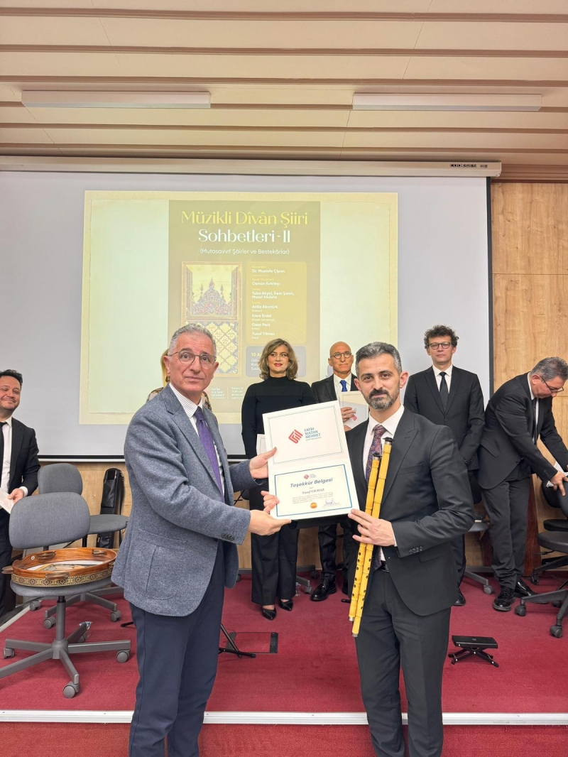 Dr. Öğr. Üyesi Mustafa Çipan’ın sunumuyla bazı mutasavvıf şairlerin hayatları, eserleri ve bu eserlerin musikiye yansıyan yönleri ele alındı; seçilen örnekler İstanbul Devlet Türk Müziği Uygulama ve Araştırma Topluluğu sanatkârları tarafından icra edilerek izleyicilere zengin bir kültürel deneyim sunuldu.