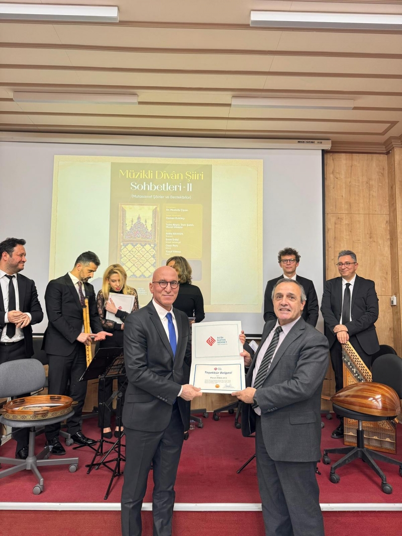 Programda, İstanbul Devlet Türk Müziği Araştırma ve Uygulama Topluluğu’nun değerli üyeleri tarafından Türk musikisinin seçkin eserlerinden oluşan bir dinleti sunuldu. Dîvân şiirinin musikî ile kesişen estetik yönlerine dikkat çekilen etkinlikte, geleneksel kültürümüzün bu iki temel unsurunun birbirini tamamlayan yapısı üzerinde duruldu.