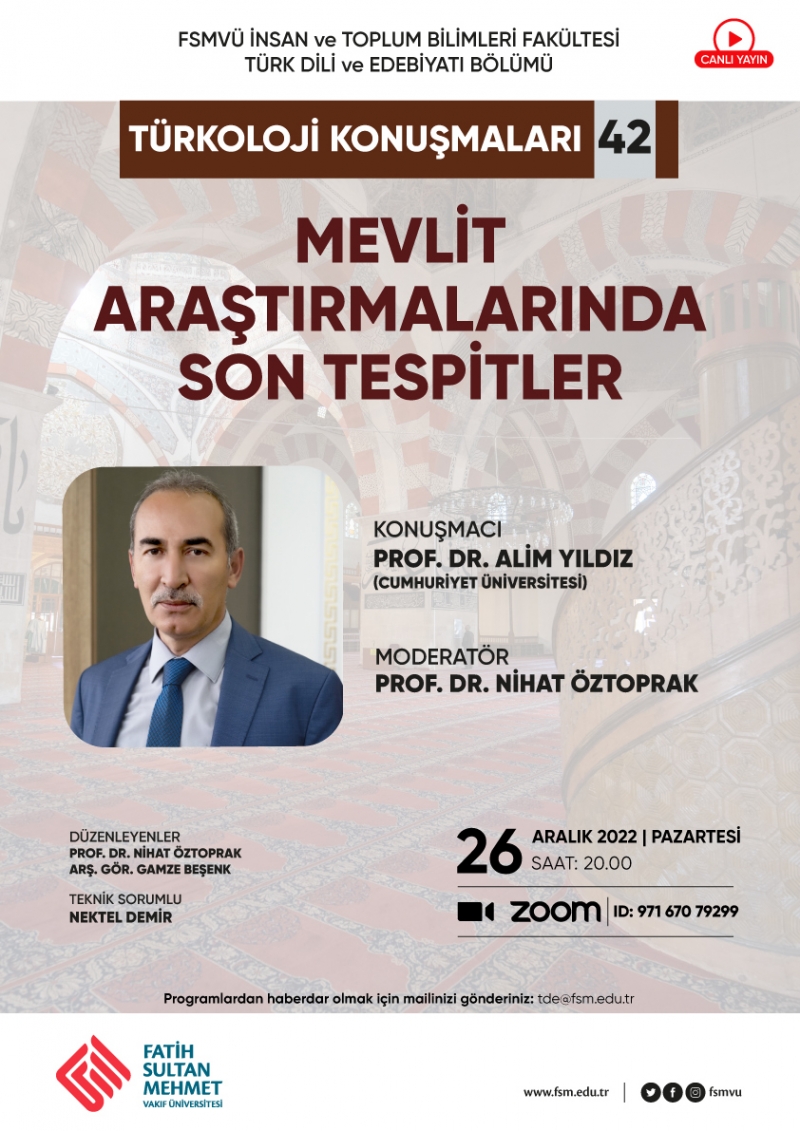 Türkoloji Konuşmaları’nın 42. Oturumu gerçekleşti. Sivas Cumhuriyet Üniversitesi’nden Prof. Dr. Alim Yıldız Mevlit Araştırmalarında Son Tespitler başlığıyla 42. oturumun konuğu oldu.